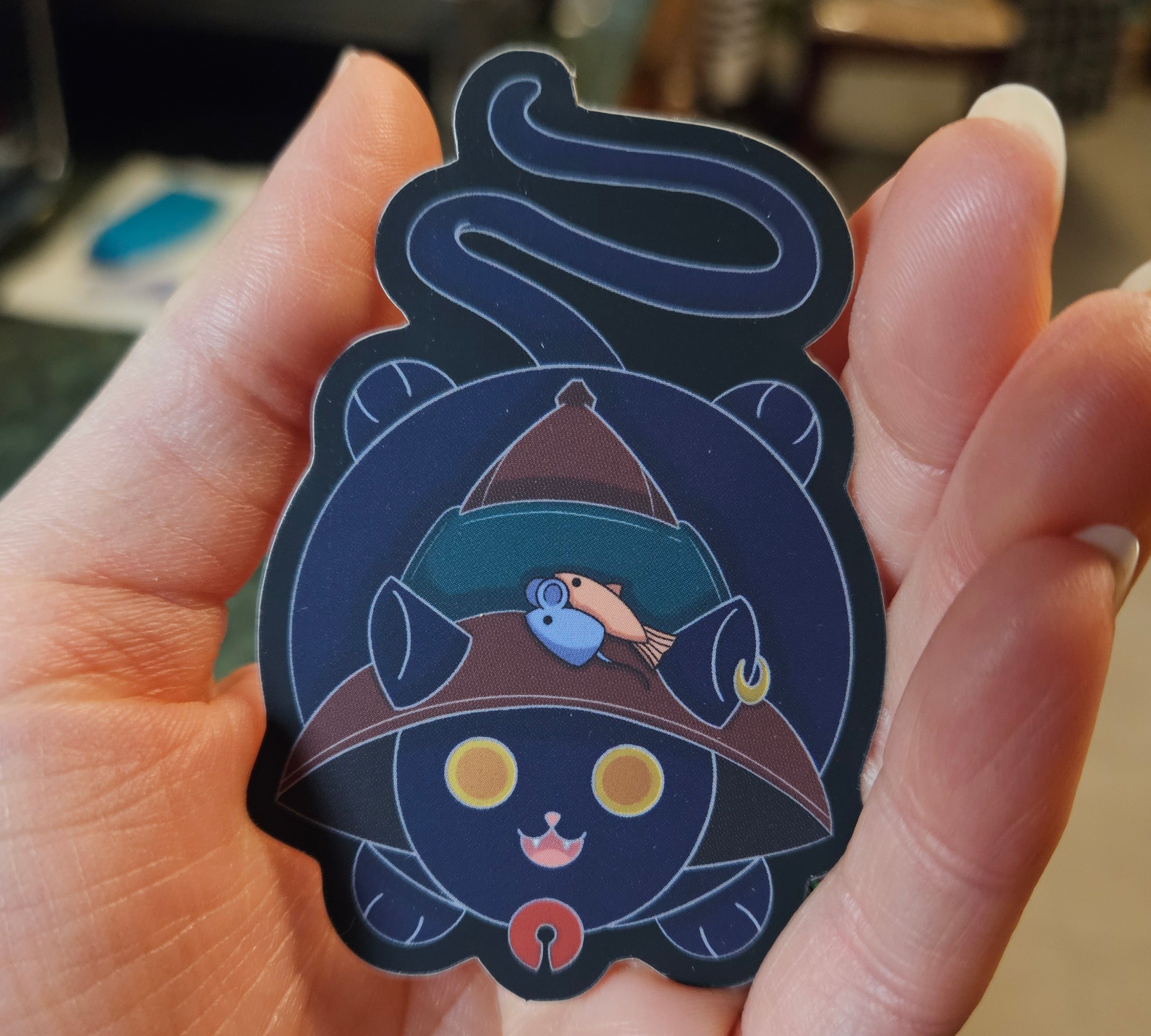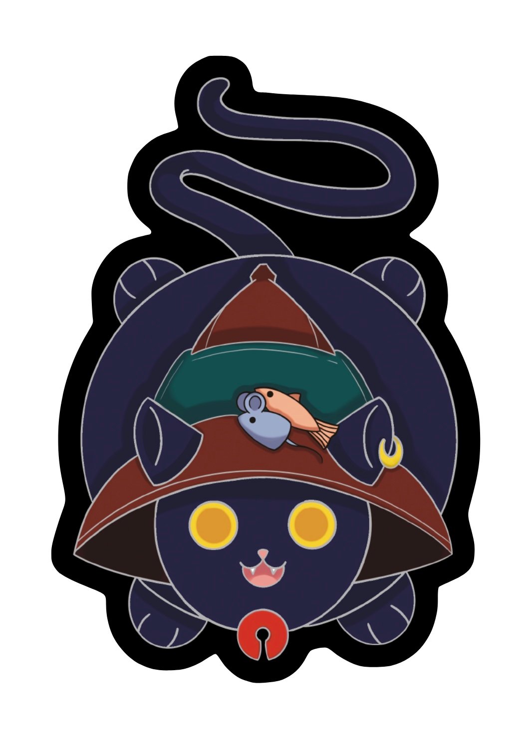This is an awesome matte mirror sticker of my oc, the witchy kitty Sassafrass! He is so cute. Stick him anywhere and he is sure to bring joy. His eyes, bell, and earring reflect for some added magic. ~2” x 3” in. ~Matte Mirror Sticker