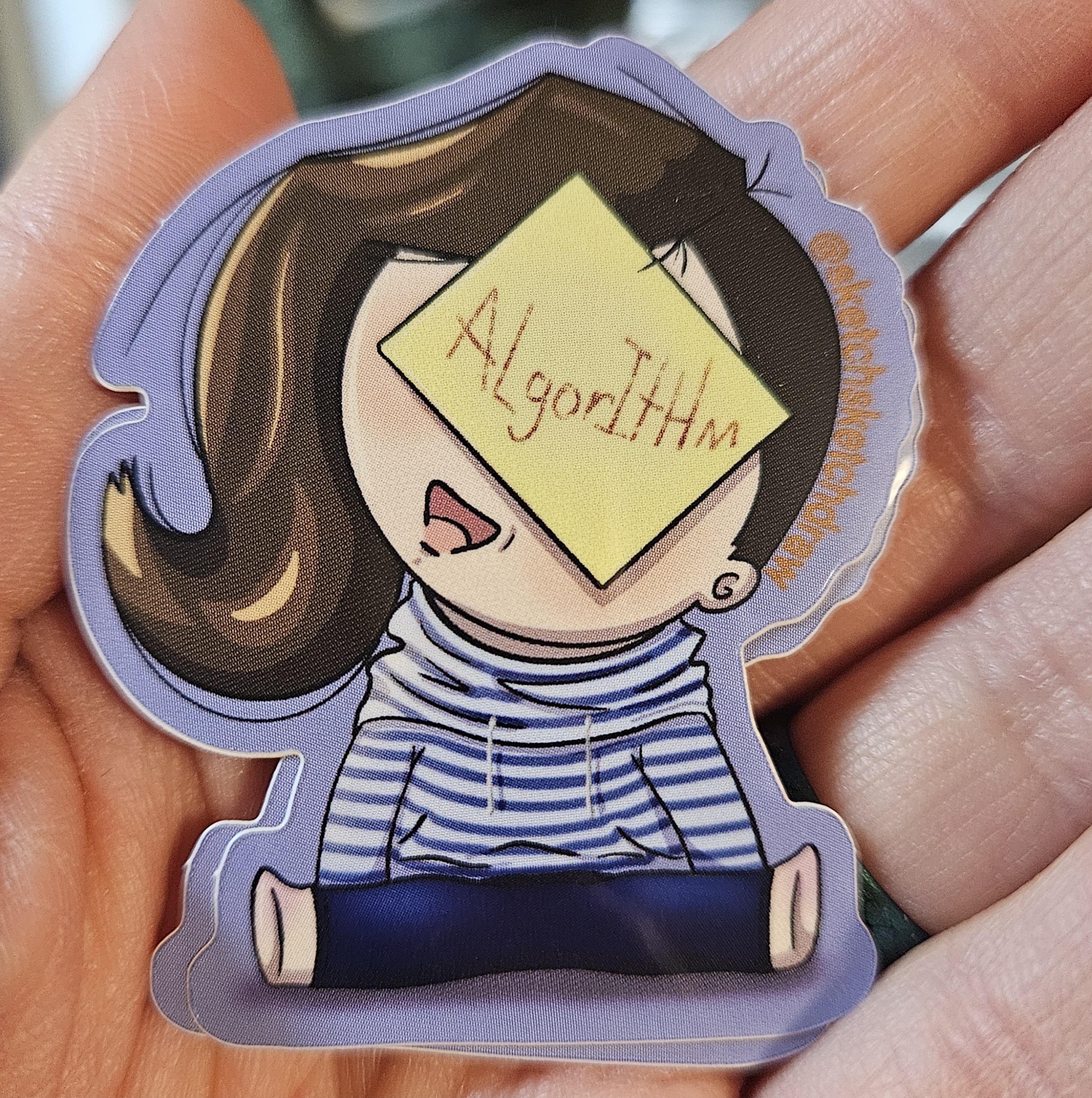 This sticker is a chibi of my personified algorithm character from my skits, available to watch on my socials. Stick it to the algorithm with this…sticker. -Glossy vinyl sticker -1.9” x 2.2”